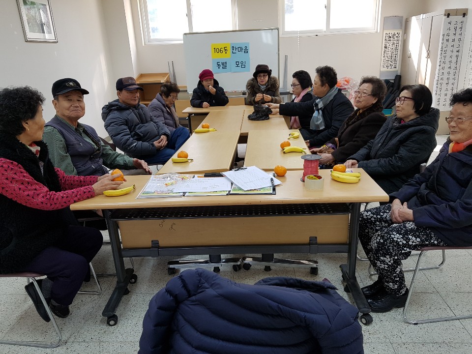 2019년 2월12일 106동 동별모임을 하였습니다. 남성어르신들 참여로 더욱 분위기가 활기차 보였습니다.