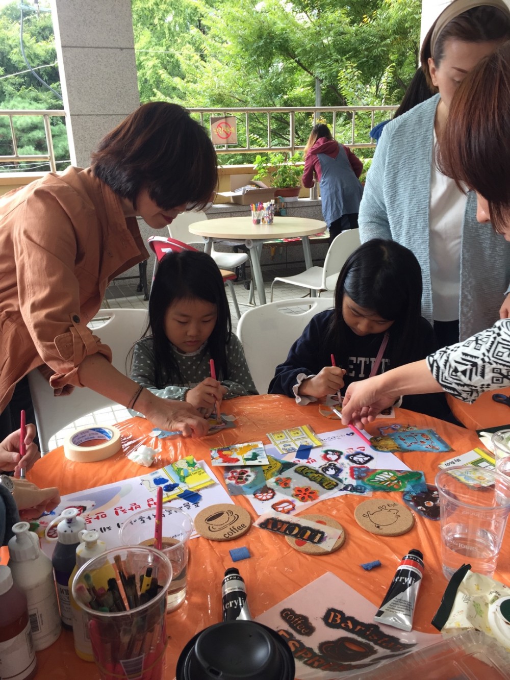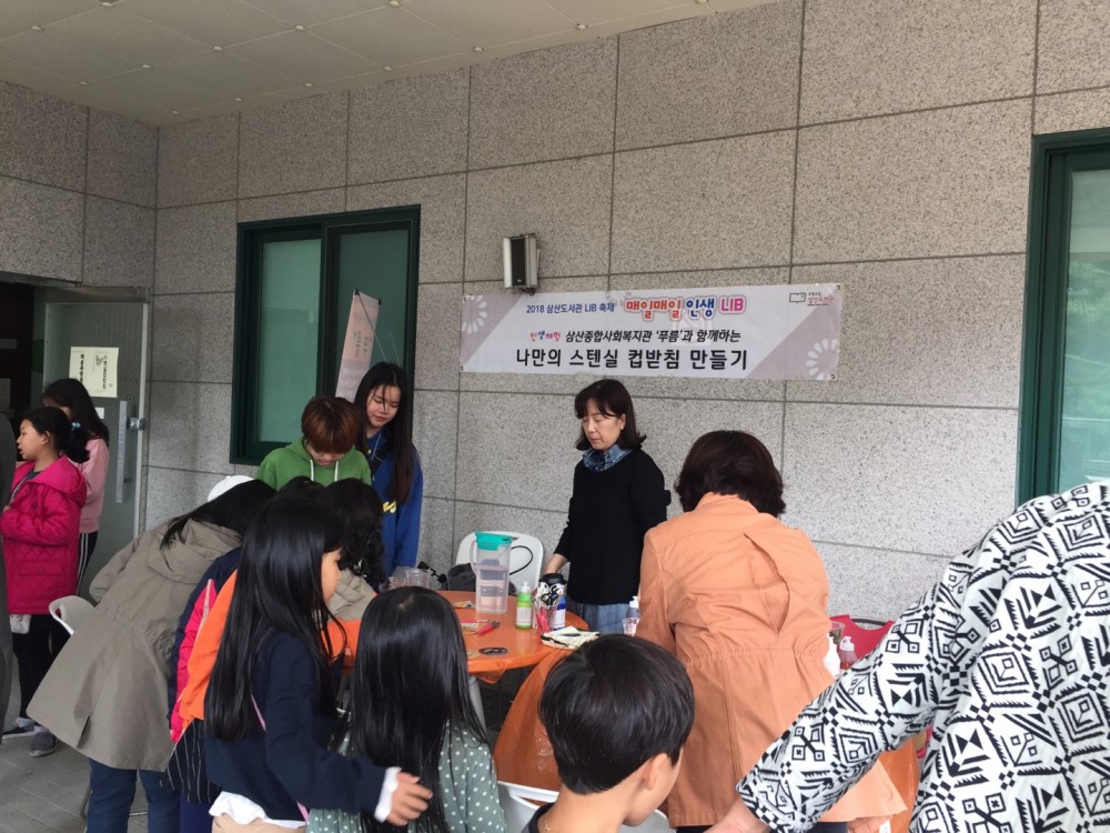 LIB축제에 참여하여 지역 내 아동을 대상으로 스텐실 컵 받침 만들기 체험부스와 제작 및 리폼 한 물품을