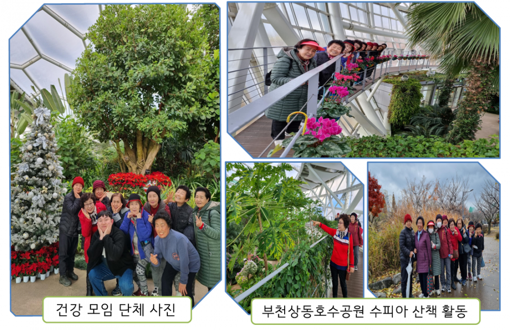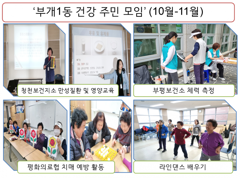 - 부개1동 건강모임은 '건강'을 매개로 이웃 관계도 새롭게 맺고 스트레칭이나 건강 지식 쌓기 등 다양한 활동을 진행하였습니다.