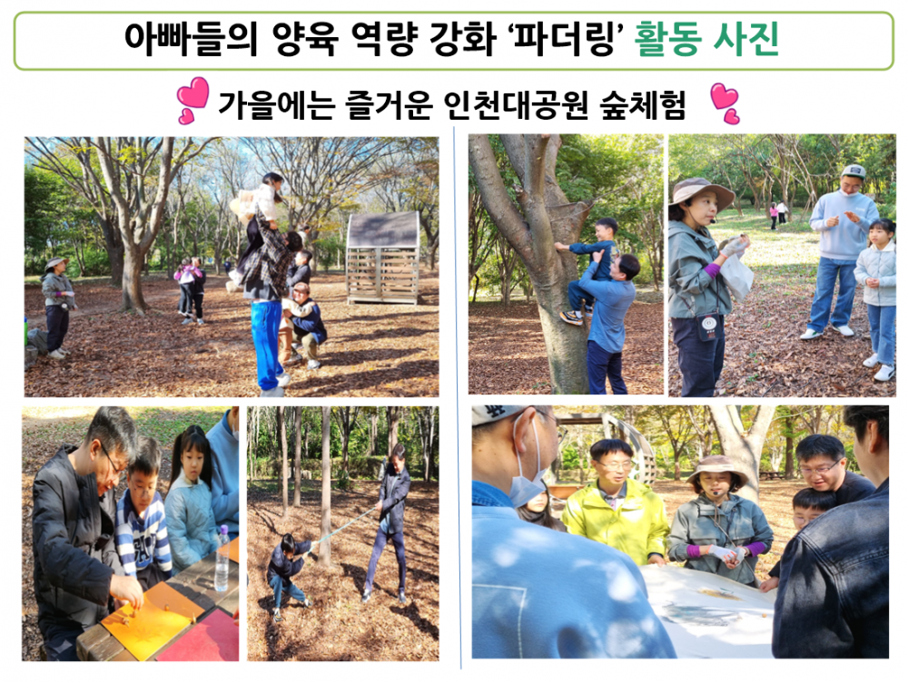 가을에는 인천대공원에 놀러갔는데요. 전문 술체험 강사님과 함께 맑은 공기를 쐬며 서로 협동 놀이를 즐겼습니다. 아이들의 웃음소리가 많이 나왔고 그만큼 아버님들의 노고가 많이 느껴진 것 같습니다.