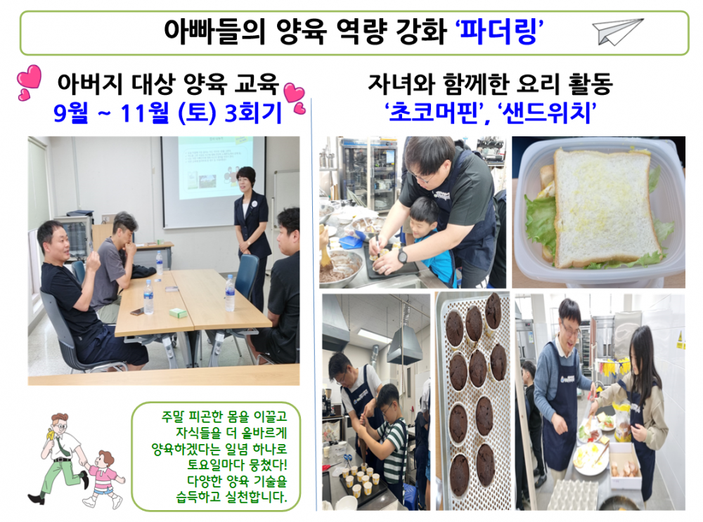 내용 : 파더링? 뜻을 혹시 아시나요? 아버지로서 자녀를 양육하다, 아버지 노릇하다라는 뜻이 있습니다. 이처럼 파더링은 아버지의 양육 방법을 알려주고 자녀와 친해질 수 있는 프로그램입니다.