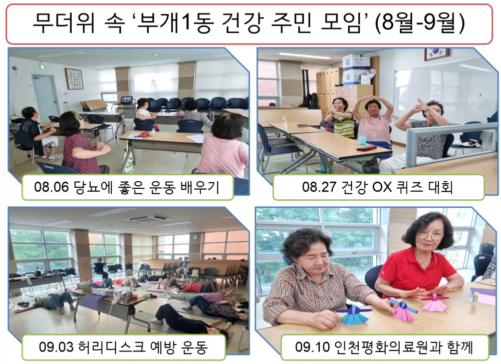 - 부개1동 건강모임은 '건강'을 매개로 이웃 관계도 새롭게 맺고 스트레칭이나 건강 지식 쌓기 등 다양한 활동을 진행하였습니다.