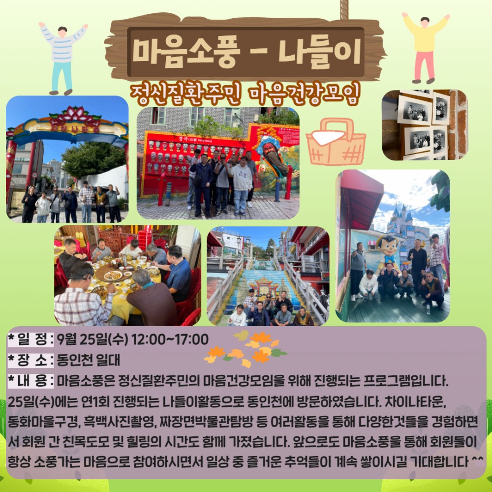 * 내 용 : 마음소풍은 정신질환주민의 마음건강모임을 위해 진행되는 프로그램입니다.