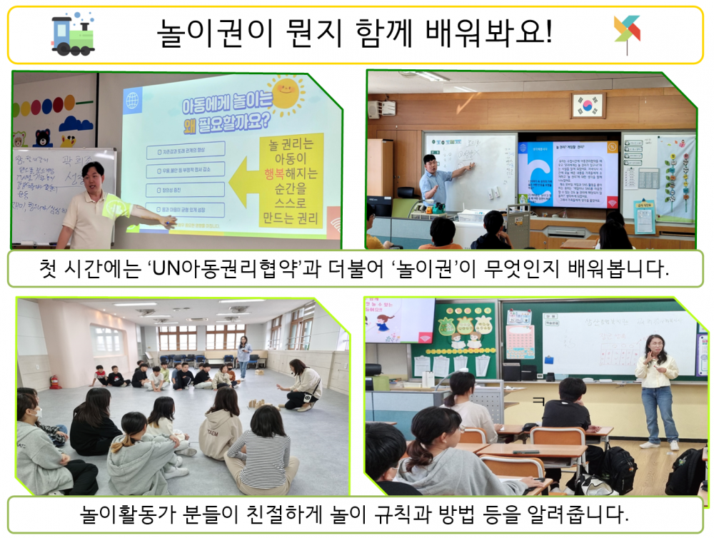 세부 내용은 놀이의 중요성을 ‘성장’과 연결시켜 전달하였고 누군가 놀이권이 뭔지 물어본다면 ‘행복해지는 순간을 스스로 만들어 가는 권리’라고 말하면 된다고 설명하였습니다.