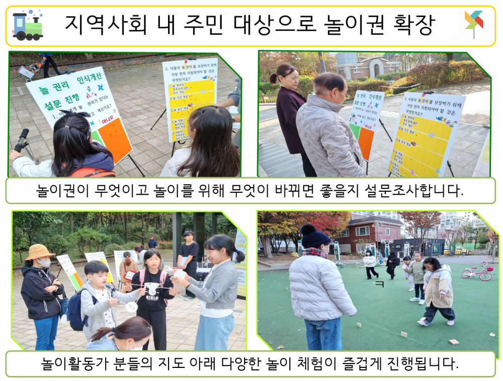 지역사회 안에서 주민들을 대상으로 놀이권을 널리 알리고자 팝업놀이터(놀이권 캠페인)을 진행하였습니다.