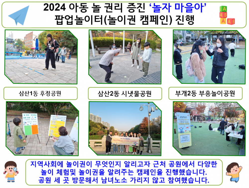 놀이 체험과 캠페인 인식개선의 두 부분으로 나눠 한 편에서는 아이들에게 놀이도 즐기고 다른 한 편에서는 왜 놀이권이 중요한지 알려주는 계기가 되었습니다.