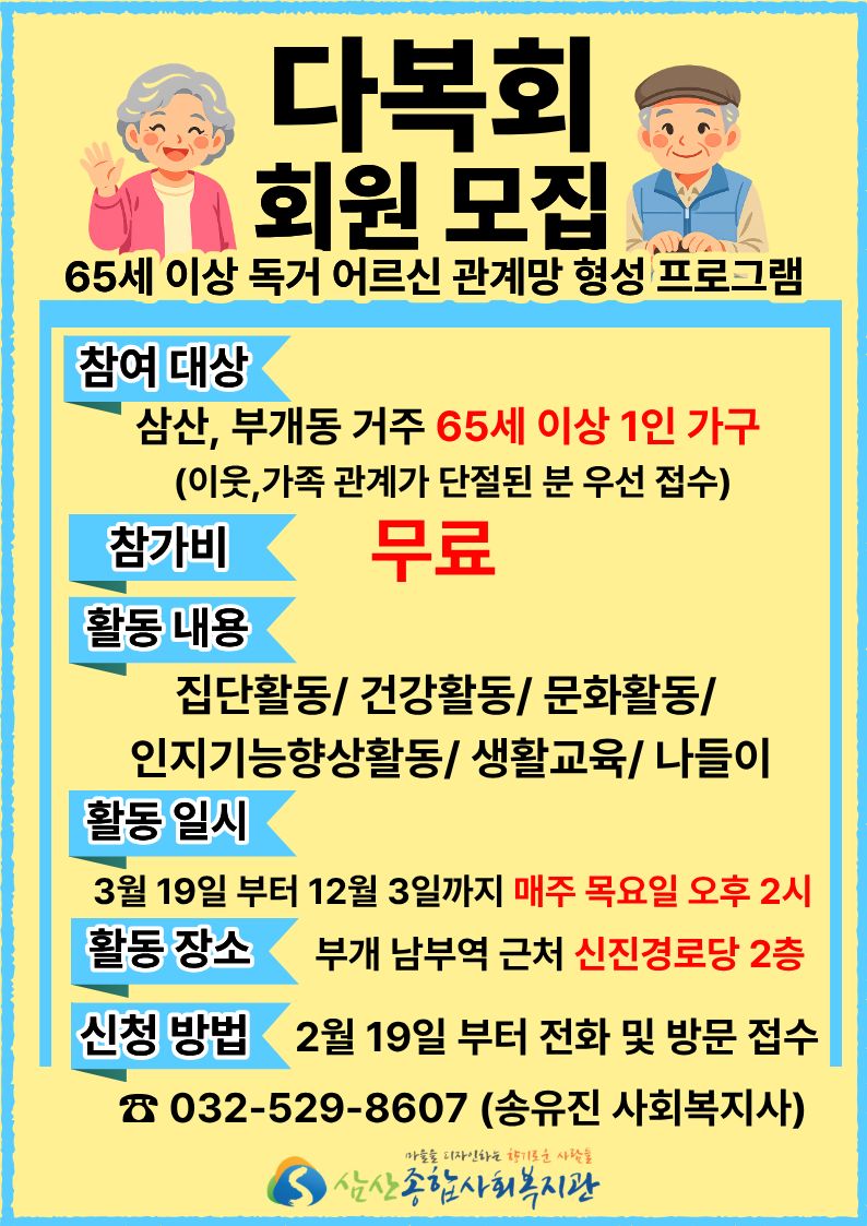 삼산종합사회복지관에서는 65세 이상 독거 어르신들의 건강한 관계망 형성을 위해 부개 1동 신진경로당 2층에서 목요일 오후 2시 [다복회]를 진행 예정중에 있습니다. 부개 1동 및 인근 지역에 거주하시는 독거 어르신들게서는 3월부터 함께 모여 다복한 시간을 만들어가시는데 참여해주시길 바랍니다! [이 게시물은 관리자님에 의해 2026-02-13 10:30:24 미디어갤러리에서 이동 됨]