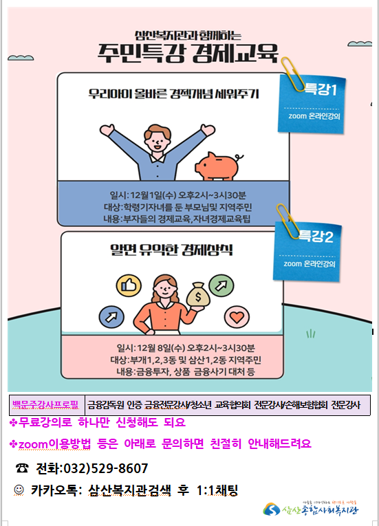 12월 1일 진행하는 경제교육은 자녀를 둔 부모님대상으로 자녀들에게 어떻게 경제관념을 심어주어야하는지 관한 내용과 자녀를 위한 유익한 정보를 알려주는 내용의 강의입니다.