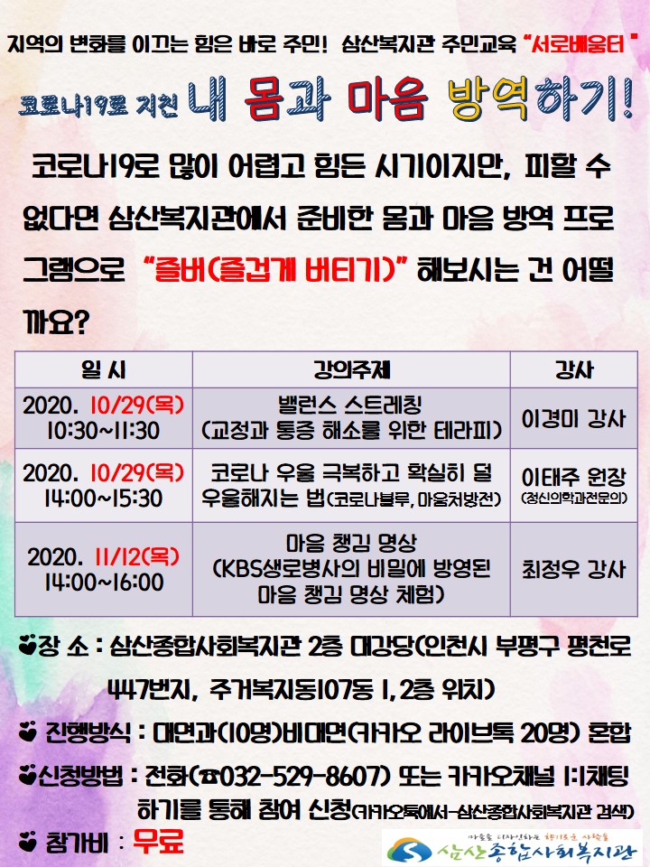 실내 10인 까지는 직접 삼산복지관으로 오셔서 강의 수강 가능하시니다.(사회적 거리두기, 방역수칙 준수) 그 외 시간 적 여유나 대면 참여가 어려운 주민을 위해