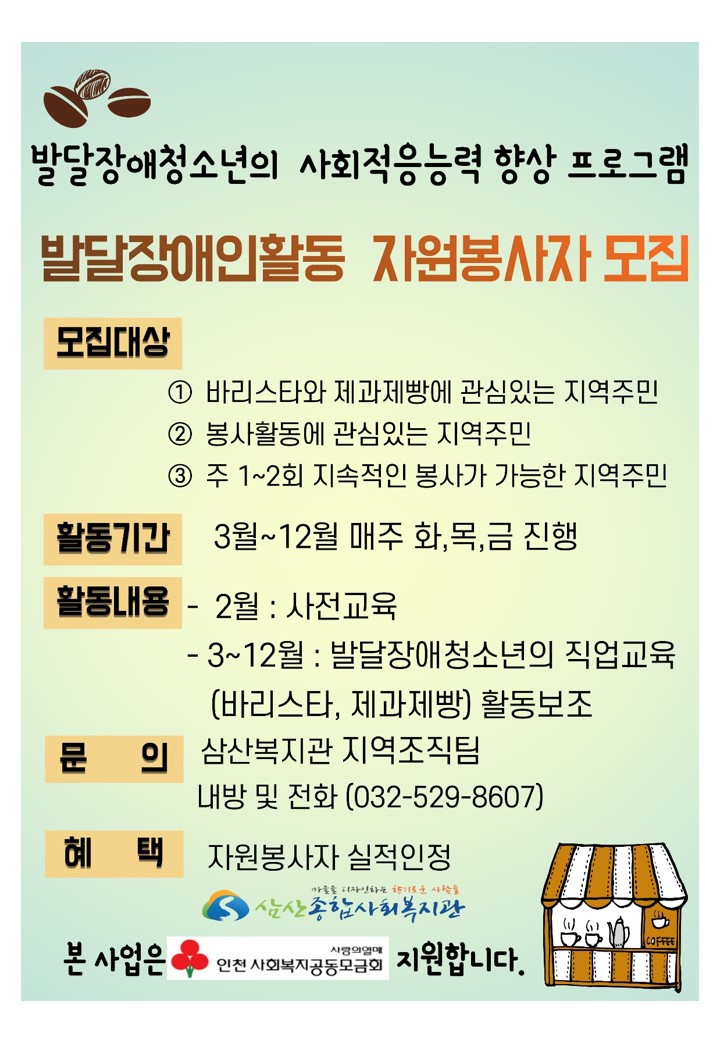 바리스타와 제과제빵에 관심이 있으며 2020년 꾸준하게 봉사활동에 참여할 지역 주민을 선착순으로 추가 모집합니다:)!