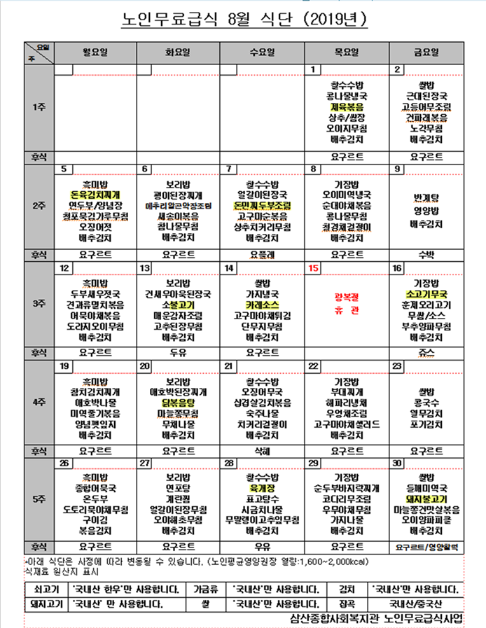 노인무료급식소 8월 식단표