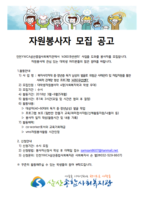 삼산종합사회복지관 '4060쿠션센터' 프로그램에서 봉사자를 모집하고 있습니다.