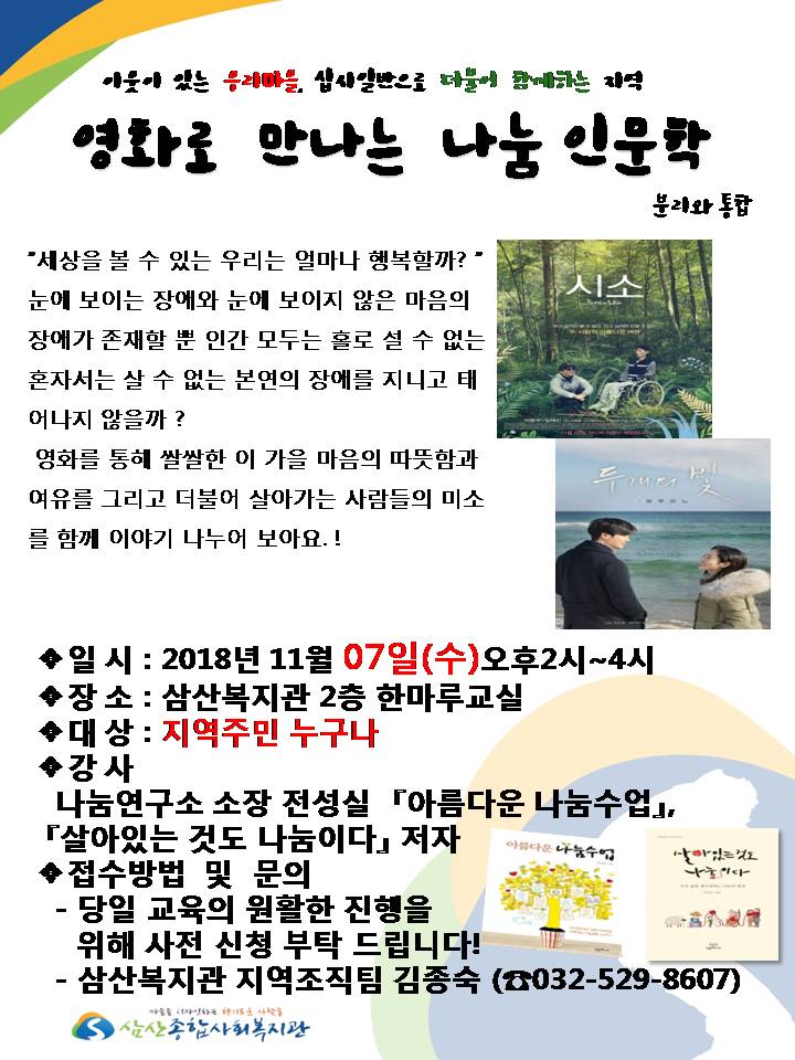 삼산복지관에서 이번주 11월 7일(수) 오후 2시~, 2층 한마루교실에서