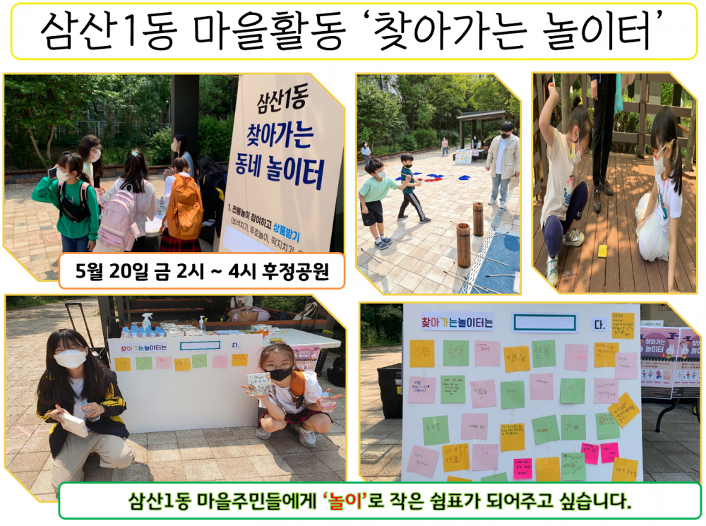 내용 : 삼산1동팀에서는 마주함 마을활동의 일환으로 찾아가는 놀이터를 진행하였습니다.
