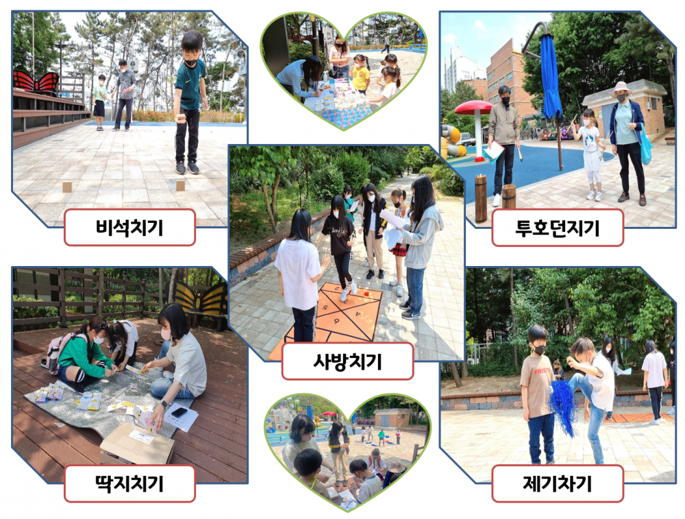 진행된 게임은 ‘사방치기, 비석치기, 딱지치기, 투호놀이, 제기차기’이고 손쉽게 접할 수 있는 전통놀이로 구성하였습니다.