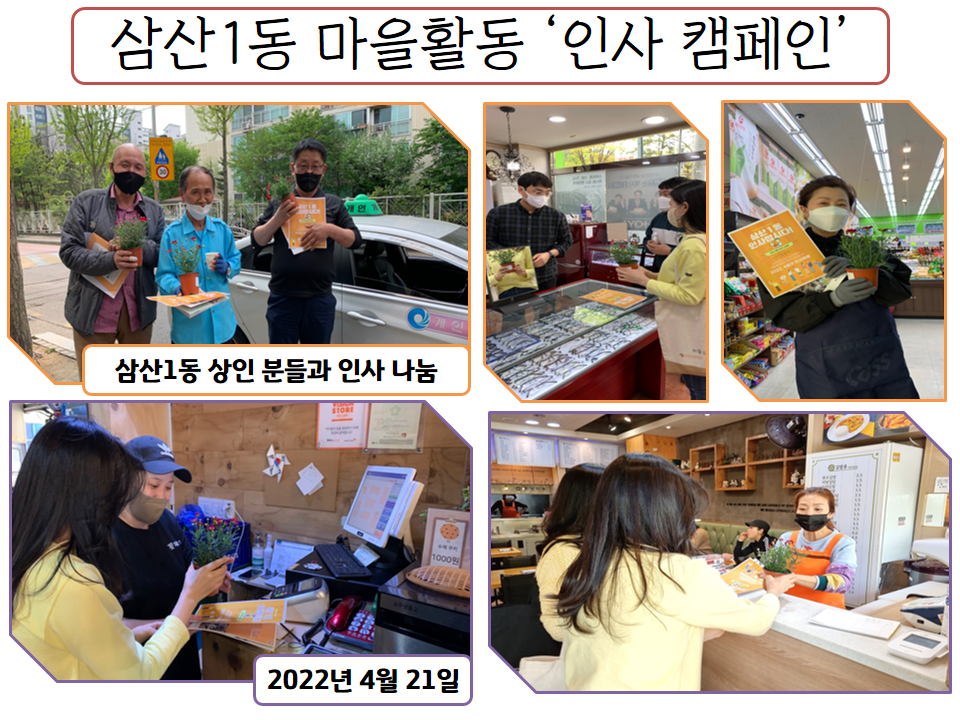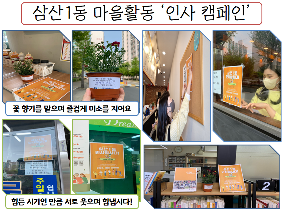 내용 : 따뜻한 햇살이 내리쬐던 어느 기분 좋은 날, 삼산 1동 팀에서는 찾아가는 인사캠페인을 진행하였습니다.