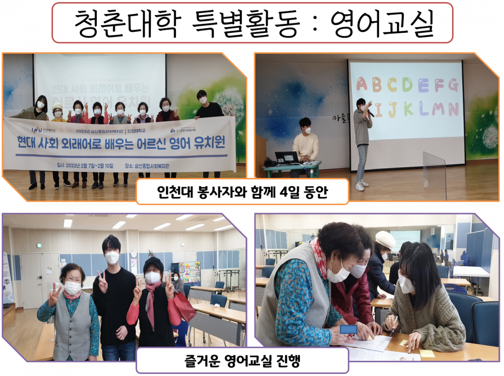 - 진행내용 : 인천대학교 자원봉사자 분들이 어르신들을 대상으로 영어 수업을 진행하였습니다.