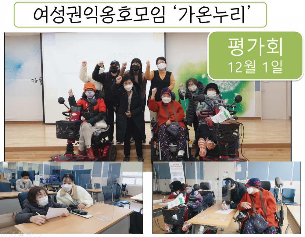내용 : 가온누리 여성 장애인분들과 올해 연말 평가의 시간을 가졌습니다. 1년간 활동 모습을 영상물로 시청하면서 감상의 시간을 가졌고 척도검사 및 평가설문도 진행하였습니다. 이를 통해 잘한 점 못한 점 구분 없이 서로 솔직하게 털어놓으면서 각자의 소회를 밝혔는데 한 참여자는 “가온누리 덕분에 많이 배우고 스스로의 권리를 소중히 여기게 되었다.”라고 피드백을 남기기도 하였습니다. 봉사자 분들도 “생애 첫 봉사가 가온누리여서 너무 좋았다. 장애인들을 바라보는 시야가 많이 달라졌다.”고 전하였습니다.