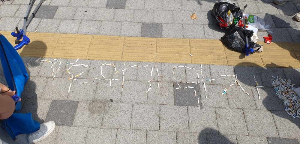 또 모은 담배꽁초로 ‘기후 위기 막자’라는 문장을 만드는 ‘쓰레기 퍼포먼스’를 진행했다.